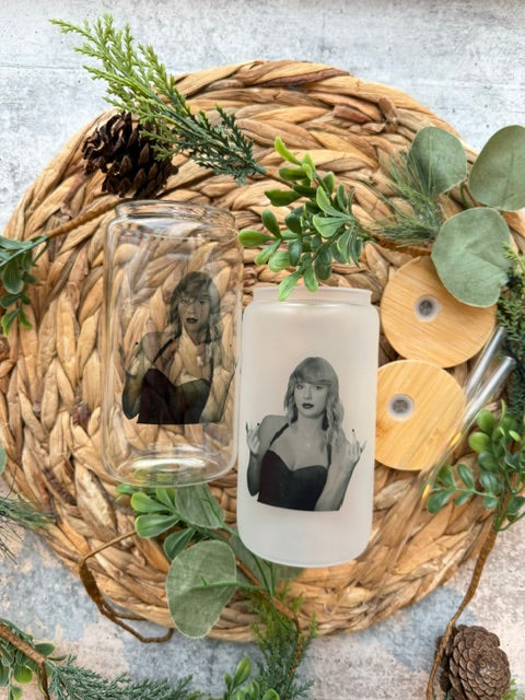 Choose between a frosted or clear glass. Printed on both sides. Comes with a bamboo lid + reusable plastic straw!