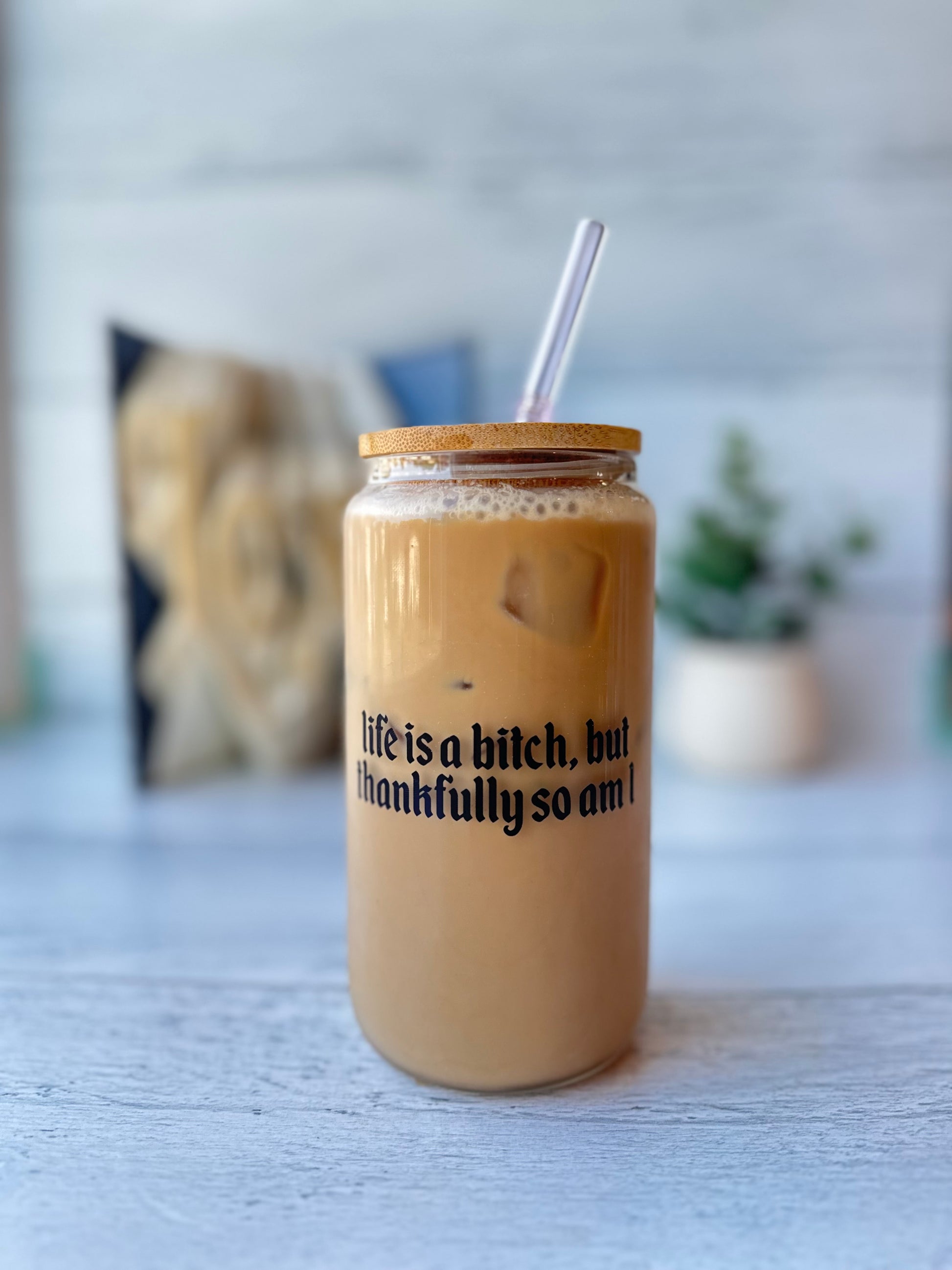 Choose between a frosted or clear glass. Printed on both sides. Comes with a bamboo lid + reusable plastic straw!